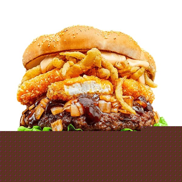 Crispy cheese stuffed with beef bacon, topped with crispy onion, BBQ sauce, grilled burger patty, and smoked cheese sauce with mushroom
