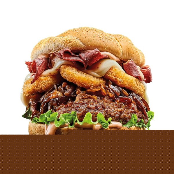 A juicy burger patty with cheddar cheese, beef bacon, crispy onion rings with BBQ sauce and caramelized onions