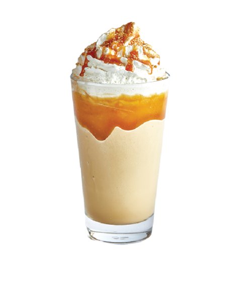 Coffee frappe with a rich caramel flavor, topped with whipped cream and caramel sauce