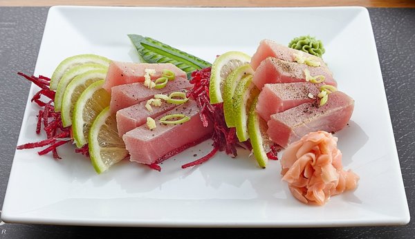 Sharp edged sushi cubes with cream cheese topped with shemagi, chives, black sesame and mint leaves