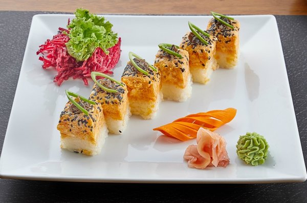 Deep fried roll with cream cheese wrapped in sushi rice and seaweed