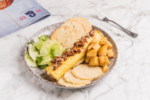 Deep fried tender beef cordon bleu, herbs and red sauce pasta on the side