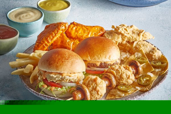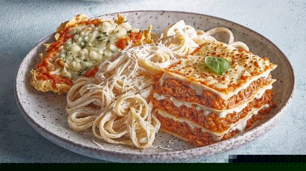 Three Italian dishes on one plate, chicken parmesan, lasagna and our signature fettuccine alfredo
