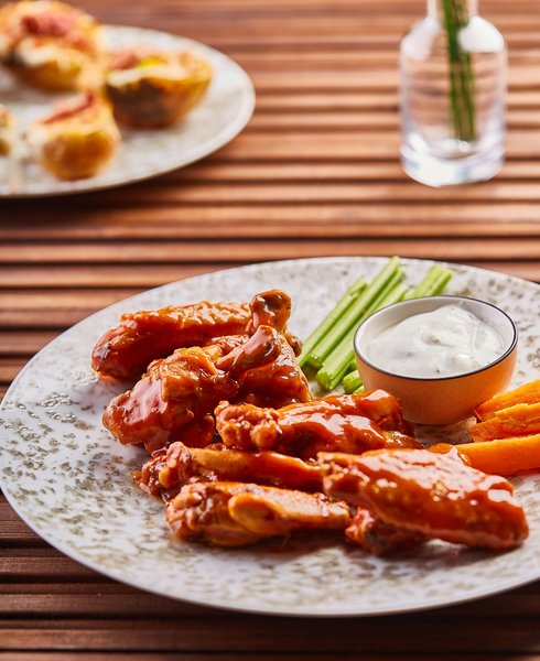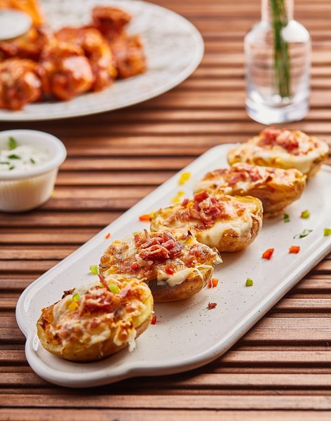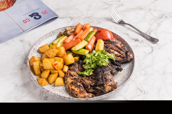 Marinated half chicken, potato harra cubes, sauteed vegetables and garlic paste