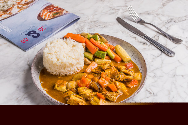 Chicken cooked in teriyaki sauce with peanuts, capsicum and white rice on the side