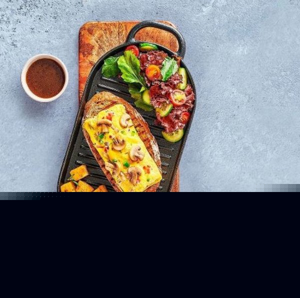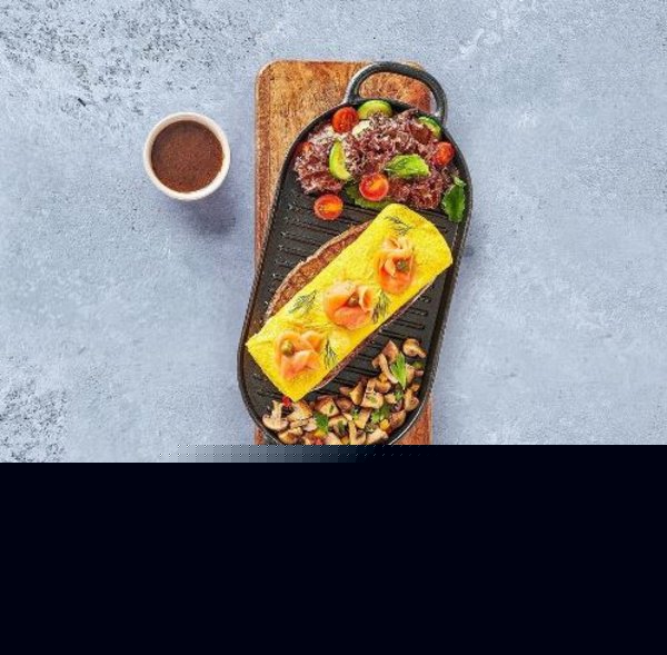 Our classic omelette with smoked salmon on freshly baked artisan bread, served with sauteed mushroom and side of fresh green salad