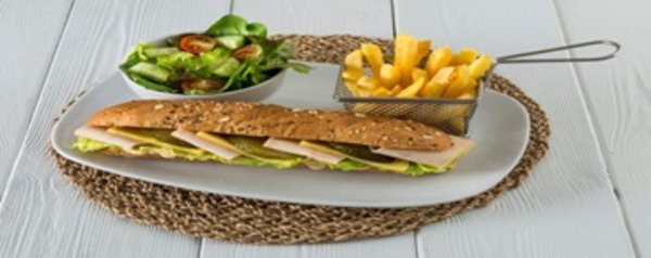 Fresh turkey, feta cheese, tomato, lettuce in a simit bread