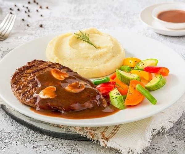 Scrambled eggs, with roasted mushroom, smoked turkey and emmental cheese, served with roasted potato and side of fresh green salad