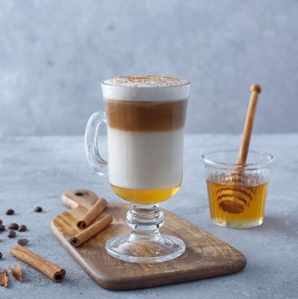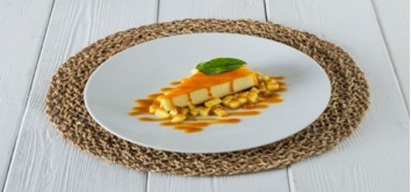 Our rich French toast filled with caramelized bananas and topped with white honey, almond and pinch of cinnamon, served with fresh fruits