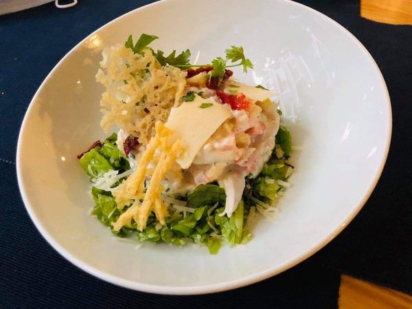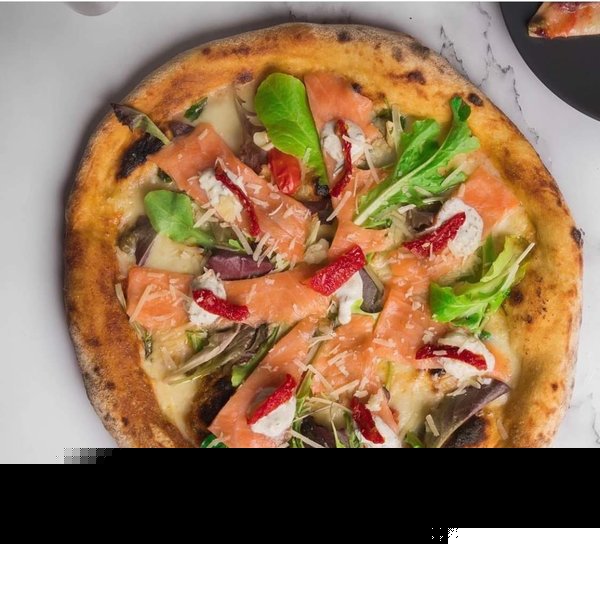 Homemade mozzarella cheese, Italian basil, organic cherry tomato, marinated salmon, fresh rocca, sun dried tomato and topped with parmesan cheese