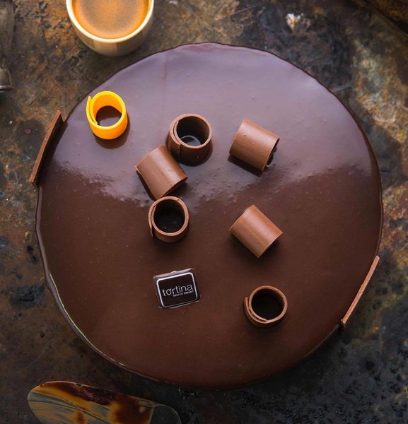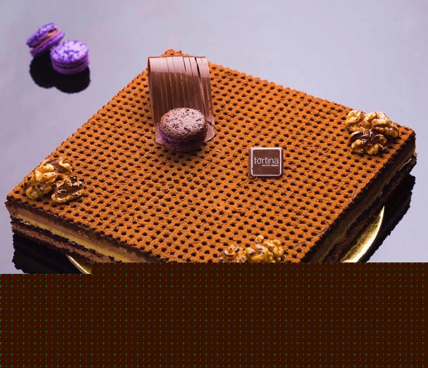 Butterscotch cake base, walnut, milk chocolate ganache and white chocolate sauce