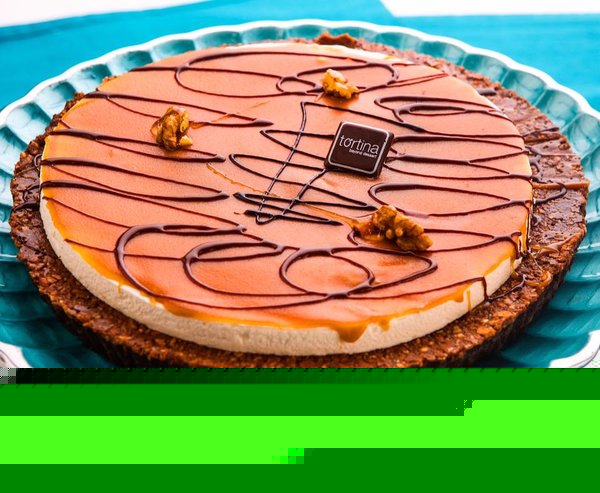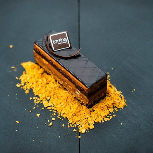 Chocolate sable crust, crispy biscuits, feuillentine, walnut mixture, cream cheese and caramel topping