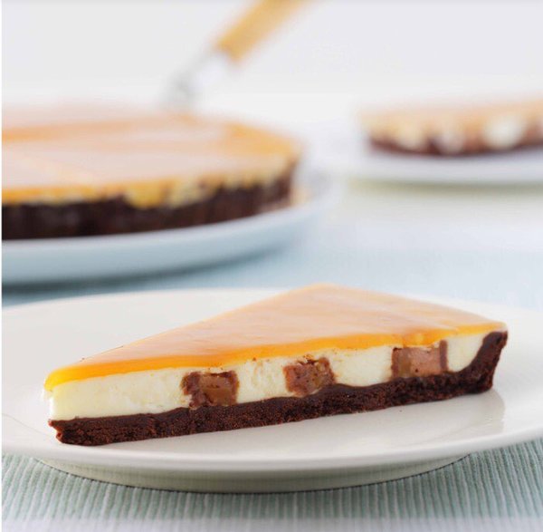 Chocolate shortbread crust, light cream cheese , chopped mars chocolate and caramel sauce