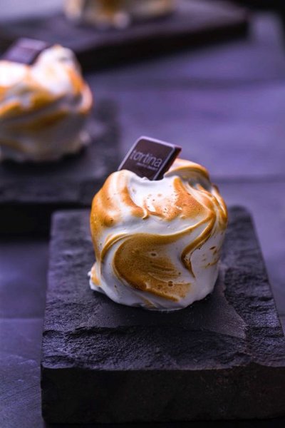 Chocolate fudge cake, chocolate feuilletine, walnut, vanilla creme brulee and chocolate cremeux